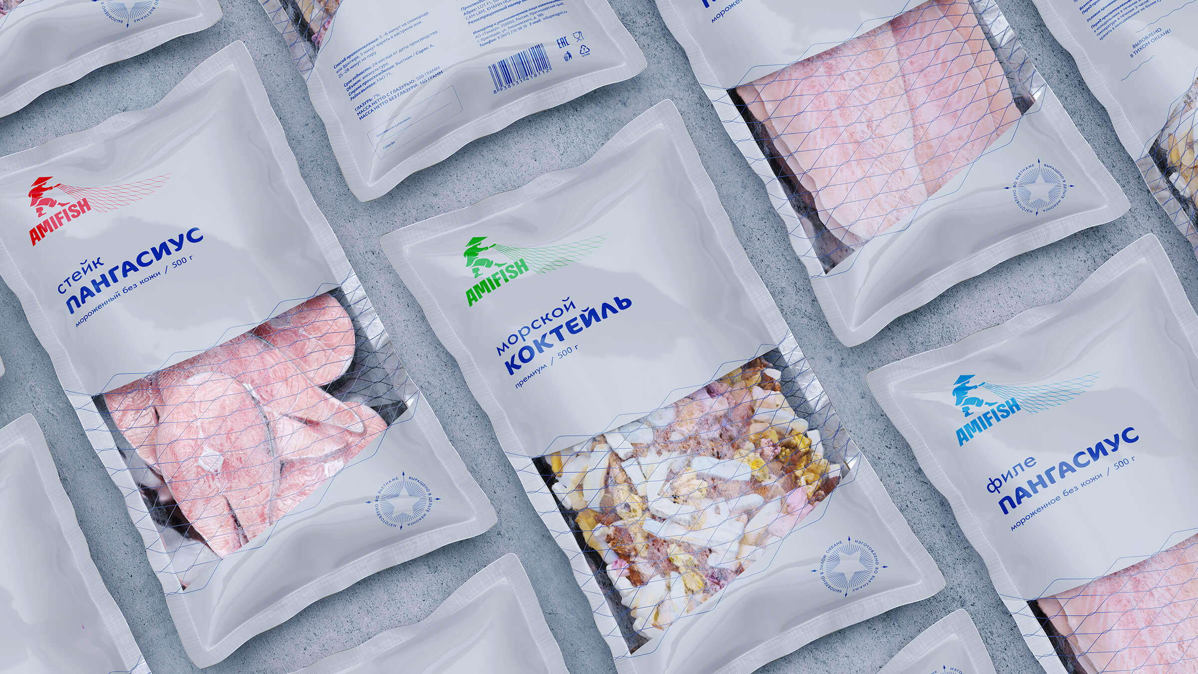 В дизайне упаковки используются клеймы со слоганами:«изготовлено во Вьетнаме, выращено в Дельте Меконга» и «выловлено в Тихом океане, изготовлено во Вьетнаме», а в качество логотипа — образ вьетнамского рыбака. На упаковке предусмотрено окно для продукции, оформленное в виде рыболовецкой сети, через которую видна продукция, содержащаяся в упаковке. Сама упаковка имеет жемчужный цвет.