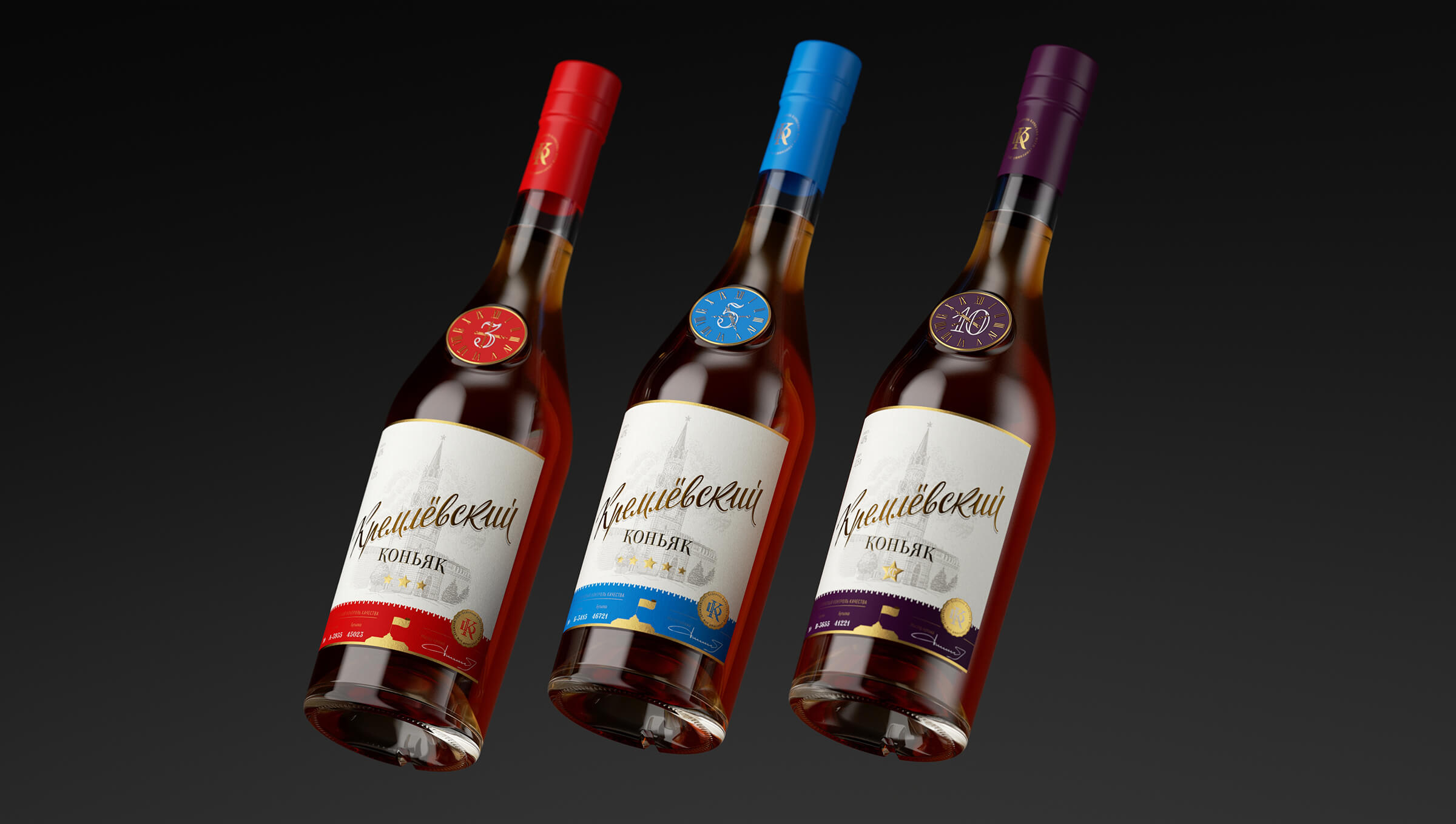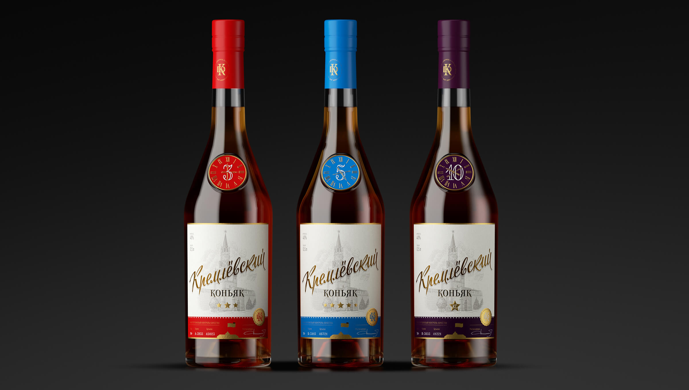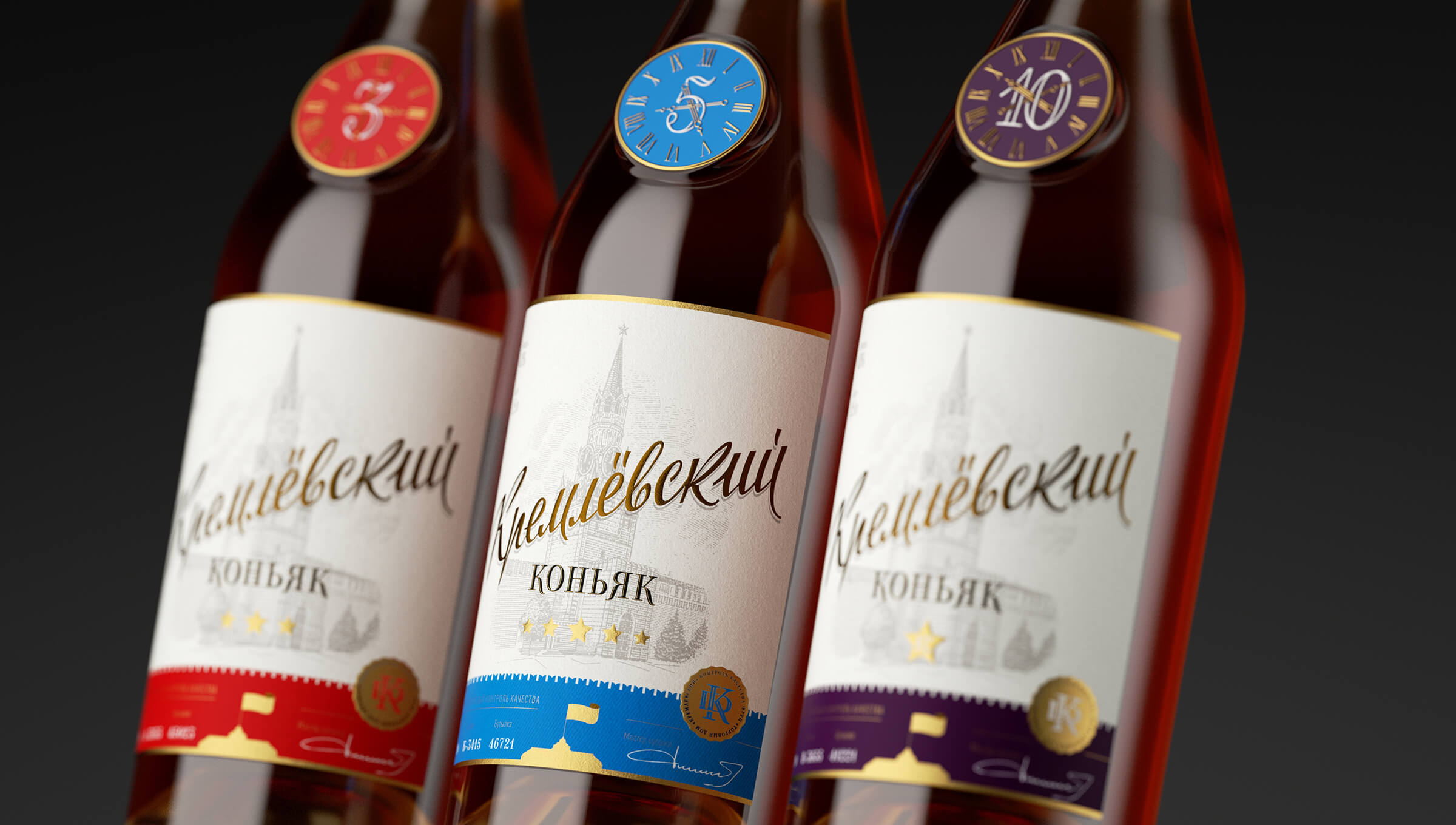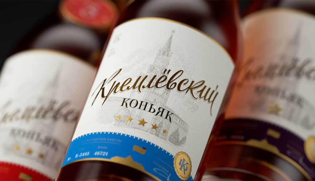 Мы заметили, что бутылка силуэтом напоминает Спасскую башню, а место для медальона, в области плечей бутылки, просто умоляет установить туда кремлевские куранты. И тогда пришла идея, чтобы часы показывали выдержку. Три часа показывают куранты трехзвездочного коньяка, пять часов пятизвездного и так далее. Композиция дизайна напоминает классическую водочную этикетку, распространенную в Советском союзе. Иллюстрация Спасской башни выполнена в модной сейчас техникой линогравюры, а дизайн логотипа названия коньяка в стиле советского леттеринга.